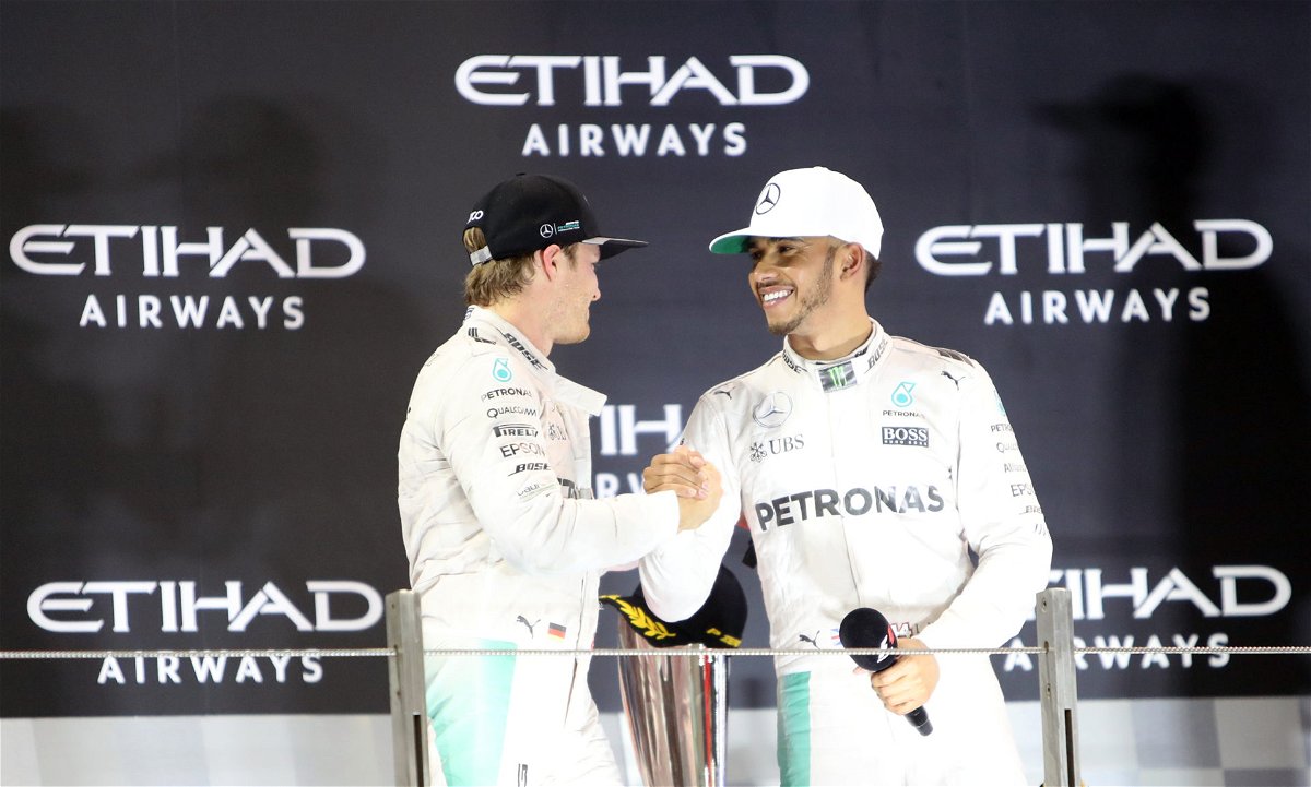 Mercedes’ Nico Rosberg (left) shakes hands with Lewis Hamilton as he celebrates winning the Formula One world championship during the Abu Dhabi Grand Prix at the Yas Marina Circuit, Abu Dhabi. (Photo by David Davies/PA Images via Getty Images)
